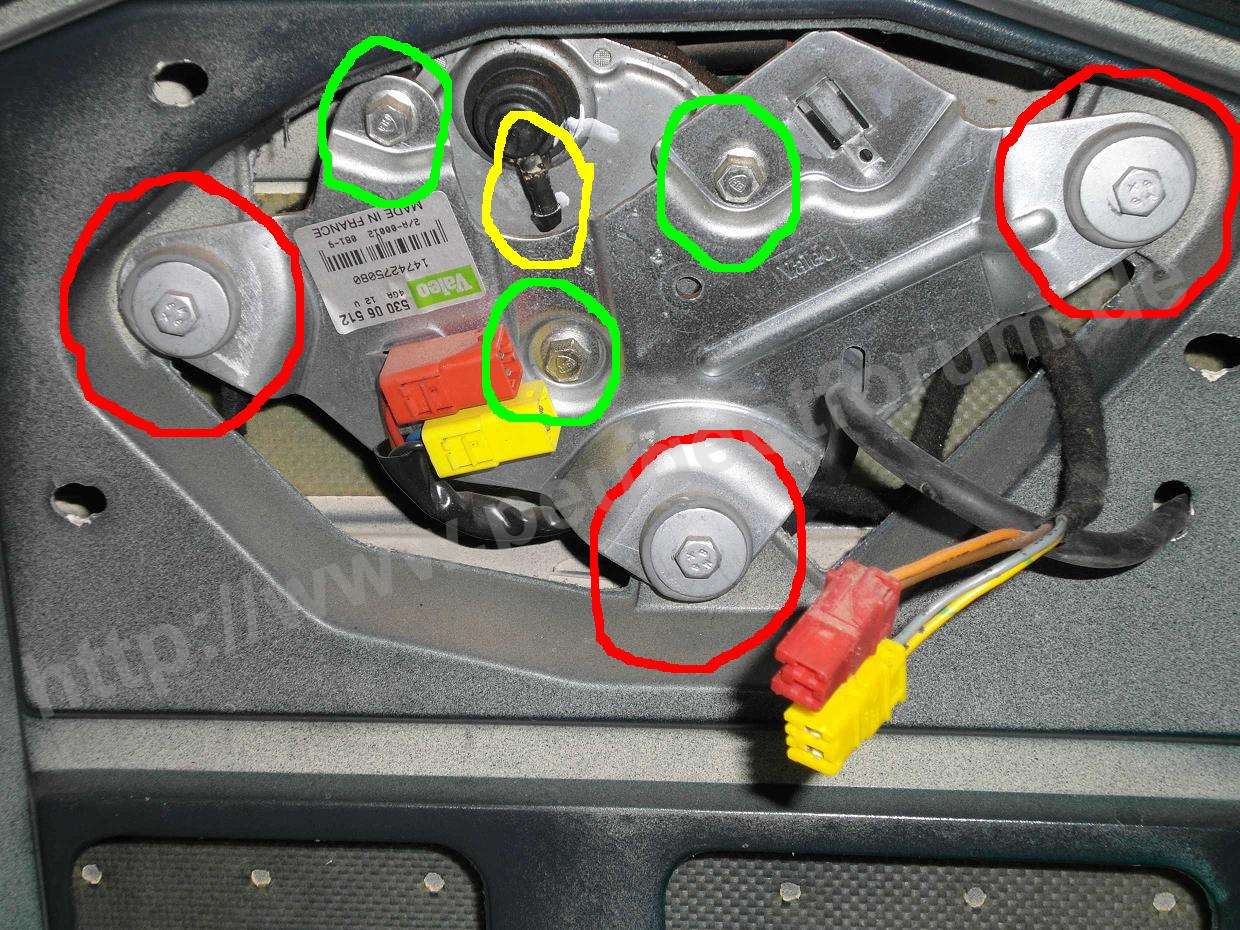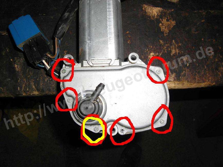 Jetzt ist der Blick auf den Wischermotor frei. Zuerst den Wischwasserschlauch der gelb markiert ist, sowie die beiden Stecker rot & gelb abziehen. Danach die 3 rot Markierten Schrauben l?sen. Der Wischermotor l??t sich jetzt raus nehmen. Ist der Motor drau?en die 3 gr?n Markierten Schrauben l?sen. Den roten, gelben sowie den Relaisestecker von der Grundplatte l?sen und sie beiseite legen.