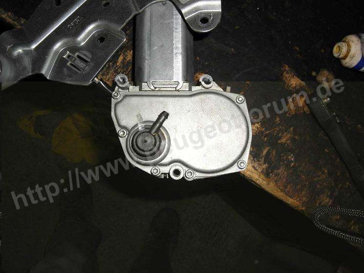 Jetzt die Wischerwelle, sowie die F?hrung daf?r mit Batteriepolfett einfetten. Die welle gleitet jetzt ganz leicht in's Geh?use. Oben am Geh?use, wo die Welle f?r den Wischerarm raus schaut, wieder mit Batteriepolfett abdichten. Den Zahnkranz mit lagerfett einschmieren. Das Kunststoffrad mit Lagerfett neu fetten und wieder einbauen.