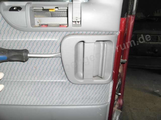 Ist der vordere Teil der T?rpappe gel?st, die Schiebe T?r ca 10 - 15cm ?ffnen. So, das der hintere Teil der T?r sich gerade von der Karosse hebt und man gerade noch mit den Fingern hinter die T?rpappe zum raus hebeln greifen kann.