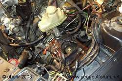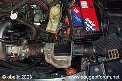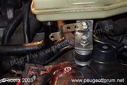 wenden wir uns dem ersten problem zu: das versetzen des beh?lters der servolenkung. nach einigem hin-und her ?berlegen fiel die entscheidung zugunsten eines einbaues neben der batterie. durch die intelligente schlauchverlegung seitens peugeot musste zuerst mal der obere k?hlwasserschlauch gel?st werden, damit der ?lschlauch ?ber die wasserleitung gef?hrt werden kann. so gewinnt man wichtige zentimeter im kampf um die schlauchl?nge, f?ngt sich aber im gegenzug daf?r ein scheuerproblem ein. die l?sung f?r dieses problem ist ein st?ck wellrohr und ein st?ck isoliermatte mit 3 kabelbindern.