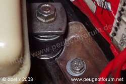 das n?chste problem ist die befestigung des lenk?ltanks. hier wurde ein silentlager verwendet (gummi-metall-element), das mit karosseriescheiben "verl?ngert" wurde, damit der beh?lter auf die richtige h?he gebracht werden kann und nirgends anst?sst. das loch f?r die befestigung befindet sich bereits im batterieboden und musste nur noch auf 8,5mm aufgebohrt werden.