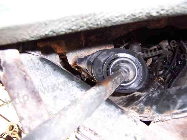 Nun kommen wir zum sch?nsten Teil der Arbeit. Die neue Manschette wieder aufziehen. Die Manschette muss daf?r so weit gedehnt werden, das sie ?ber den Zapfen f?r den Servozylinder geht. Dazu hab ich mit einem gro?em Schraubendreher nachgeholfen. Aber aufpassen, dass die neue Manschette nicht rei?t. Sehr zeitaufw?ndig und krampfhaft f?r die Finger. Auf der rechten Seite und bei Modellen ohne Servolenkung ist das nat?rlich um einiges leichter.
