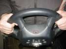 einf?deln, und den w-f?rmigen Haken (Bild 2) nach oben dr?cken. Dadurch wird der Teil mit dem Airbag (Bild 3) freigegeben. Nach dem ihr die Kabel abgeschlossen habt, k?nnt ihr mit einem Torx-Schrauber die Schraube (Bild 4) ?ffnen. Mit ein - zwei sanften Schl?gen das Lenkrad lockern und dann Richtung Fahrer abziehen. Wenn ihr einen Metallstift nehmt und die Batterie nicht abgeh?ngt habt, kann es vorkommen, dass ihr ein paar mal hupt bis der Airbag herau?en ist.