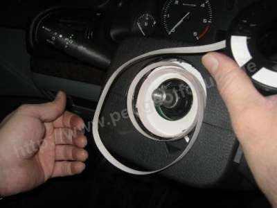 Vorsicht: Nicht zu sehr anrei?en, da ihr sonst den Schleifkontakt (Bild 5) mit "ausbaut". Sollte euch dieses Missgeschick trotzdem passieren, m?sst ihr den Schleifkontakt aufrollen und wieder einsetzen. Dann ist noch der Plastikring mit der Feder (Bild 6) einzusetzen. Bitte ber?cksichtigt vor dem Einbau des neuen Lenkrades die Anzahl der Lenkradumdrehungen die ihr vorher ermittelt habt. Einfach diese Anzahl nach links zur?ckdrehen.