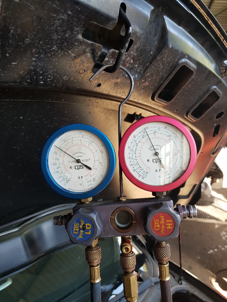Nun war ich gerade in einer Peugeot / Renault Vertragswerkstatt. Klimagerät angeschlossen und das Diagnosegerät auch. Die Drücke seht Ihr auf dem Bild. Diese ändern sich kaum beim Gas geben.