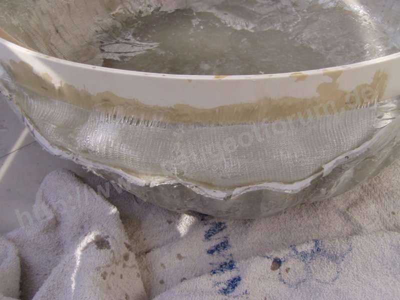 Der Randabstand der Wanne zum Ring betr?gt in diesem Falle zwischen ca. 2cm und 10cm. Nun mu? nat?rlich der Freiraum gef?llt werden. Wie? Man kann nat?rlich Kiloweise Spachtel nehmen - was die Sache allerdings sehr schwer macht und solch gro?e Abst?nde in Form zu Spachteln, ist nicht wirklich einfach. Also de Maggus hat noch eine kleine Glasfaser-Lage eingelegt. Ihr seht auf dem Bildchen einen Ausschnitt der Wanne mit den bereits eingeharzten und in Form gebrachten Matten. Abh?ngig von der Stabilit?t ?berlege ich mir nach dem Aush?rten, ob ich noch ein L?gelchen Matten verbaue oder den Rest einfach zuspachtele. Hauptsache das ganze wird ordentlich dicht !!