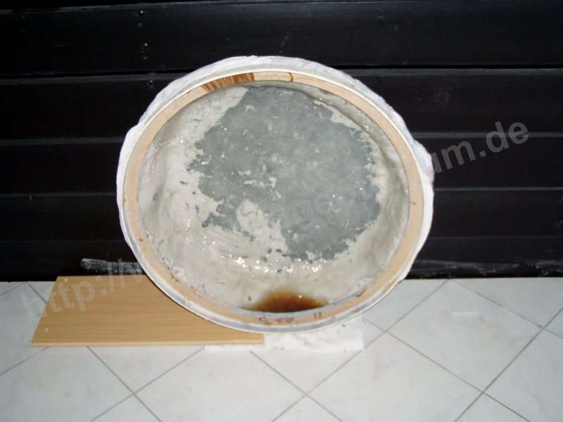 Den Holzring m??t Ihr auf so einer Wanne nat?rlich waagerecht ausrichten. Wie machen? Normalerweise sollte man das ganze wieder ins Auto legen und den Ring, bzw. das Brett mittels Wasserwaage waagerecht ausrichten. Wenn dies in beide Richtungen geschehen ist, mu? Hei?kleber her, um die Form zueinander zu fixieren - wenn`s allerdings nicht verrutscht, k?nnt Ihr auch gleich 2-3 Ecken ein bisschen anspachteln.