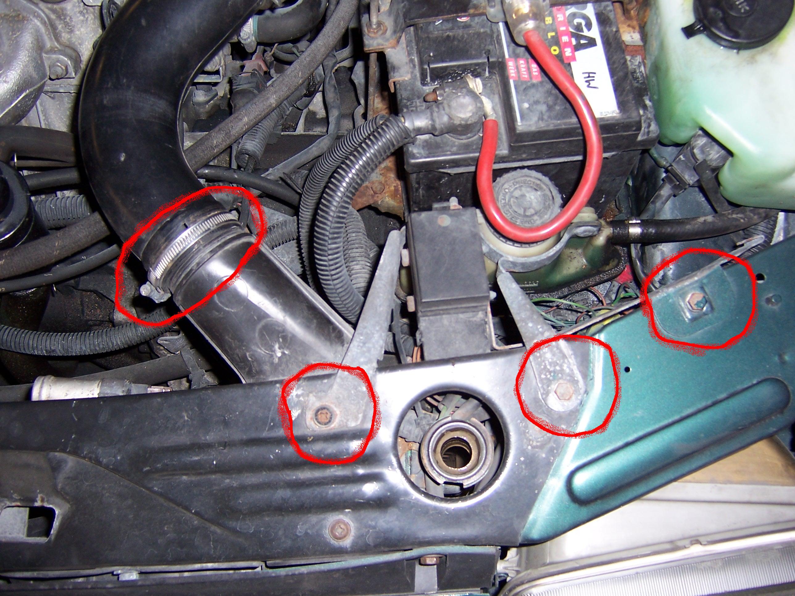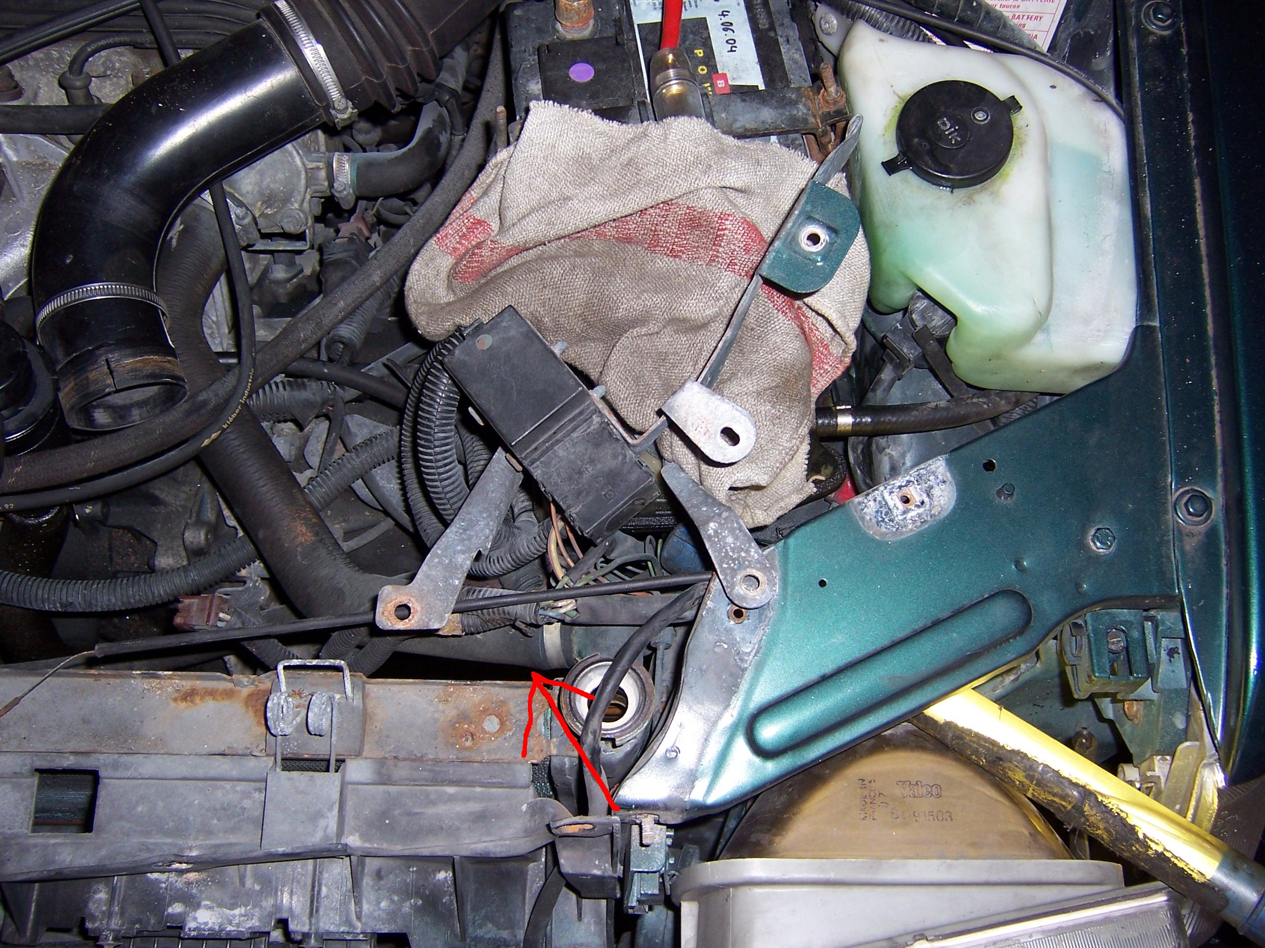 Nun die Halteklammern anhebeln und erstmal die Gummiführung da drunter entfernen. Nun beide Halteklammern gleichzeitig anheben und den Kunstoffträger für die Kühlerlüfter nach vorn hin weg klappen