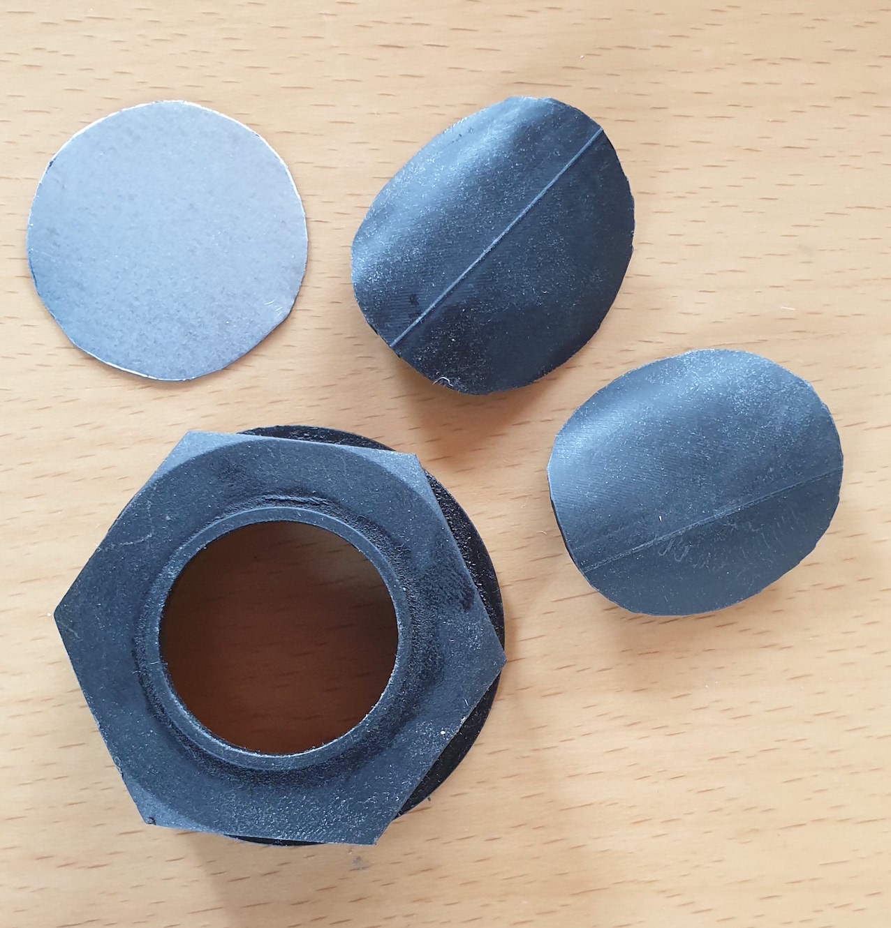 Das besagte Teil leckt - ganz oben kommt die rote Sauce raus. Daher jetzt die Redneck-Lösung: Eine Scheibe aus dünnem verzinktem Blech mit 32 mm ø geschnitten. Dazu zwei Scheiben aus dünnem Gummi mit gleichem Durchmesser aus einem Fahrradschlauch geschnitten. Vorder-Rückseitig auf das Blech geklebt, zwei dicke Karosseriescheiben aus VA als Distanzhalter eingesetzt und gut war die Welt. Dicht ist.