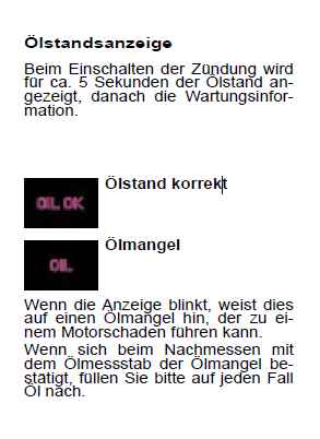 b) Und was ich genau meinte ist das, daß wenn er beim einschalten sagt das zuviel oder zuwenig öl drin ist - siehe oben Punkt 2 - dann müßte doch auch diese Meldung erscheinen - Siehe Anhang - Ölstandsmeldung?