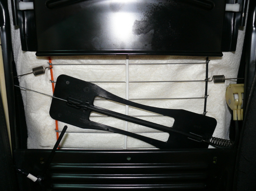 Ich habe es jetzt geschafft, die Polsterung so weit abzumachen, dass ich einen guten Überblick über diesen Mechanismus habe sowie Platz zum Arbeiten.