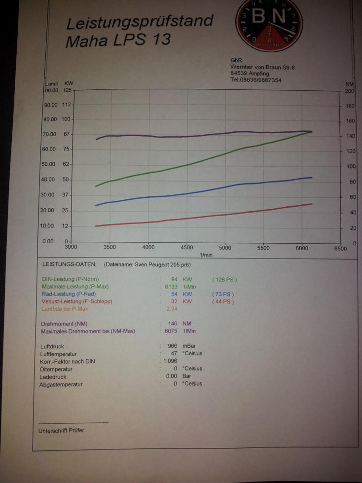 Ausserdem haben wir den Messchrieb bei ca. 6200 1/min gekappt, da darüber Schwingungen auftraten, die eine saubere Messung vereitelt haben. Die Leistung stieg aber bis 6800 1/min an.