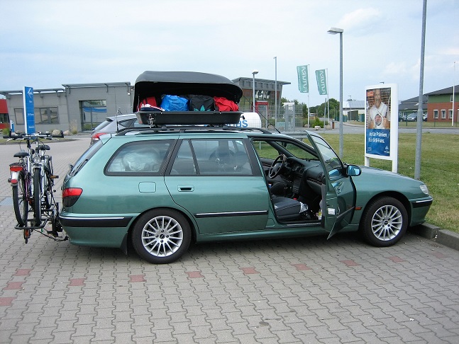 der 406 geht nicht so weit in die knie, dachkoffer mit 50 kg, kofferraum schwer beladen und 2 räder hinten drauf: