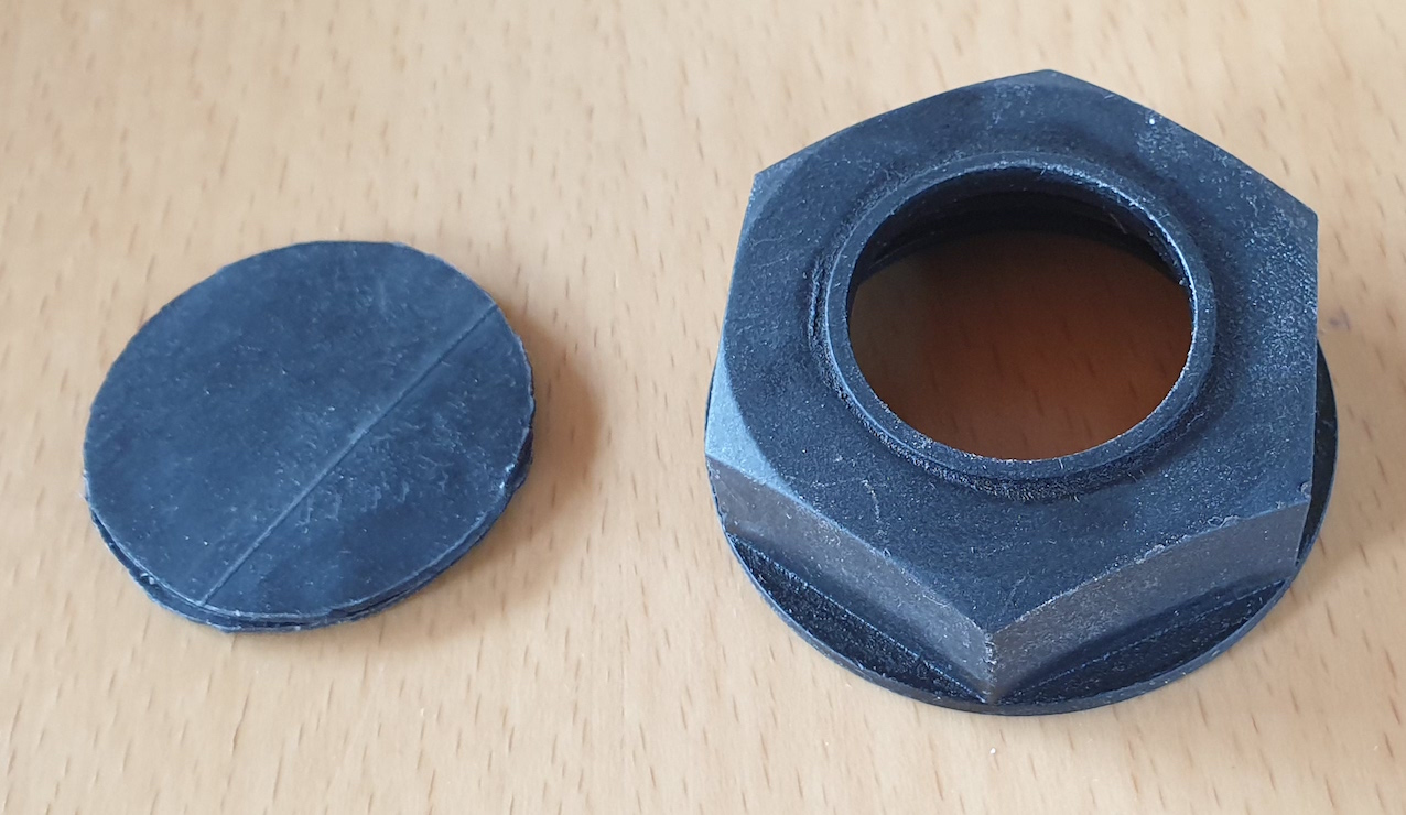 Das besagte Teil leckt - ganz oben kommt die rote Sauce raus. Daher jetzt die Redneck-Lösung: Eine Scheibe aus dünnem verzinktem Blech mit 32 mm ø geschnitten. Dazu zwei Scheiben aus dünnem Gummi mit gleichem Durchmesser aus einem Fahrradschlauch geschnitten. Vorder-Rückseitig auf das Blech geklebt, zwei dicke Karosseriescheiben aus VA als Distanzhalter eingesetzt und gut war die Welt. Dicht ist.