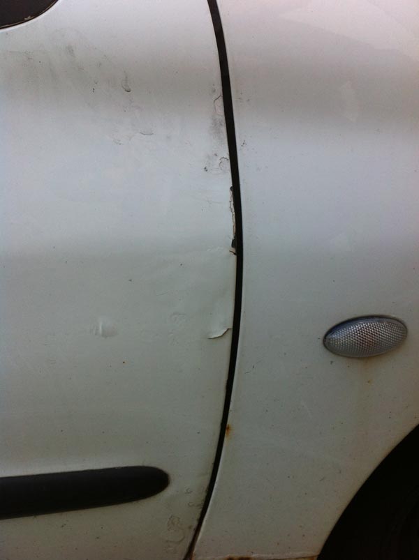 - Die Fahrertüre besteht großteils aus Spachtelmasse, über der die Lackierung aufgebrochen ist (siehe Bild)