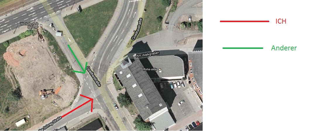 so ich komm jetzt von der rot makierten Nebenstraße und auf der Grünmakierten Nebenstraße kommt ein anderer. Interpretiere ich die Zeichen richtig habe ich doch vorfahrt oder?