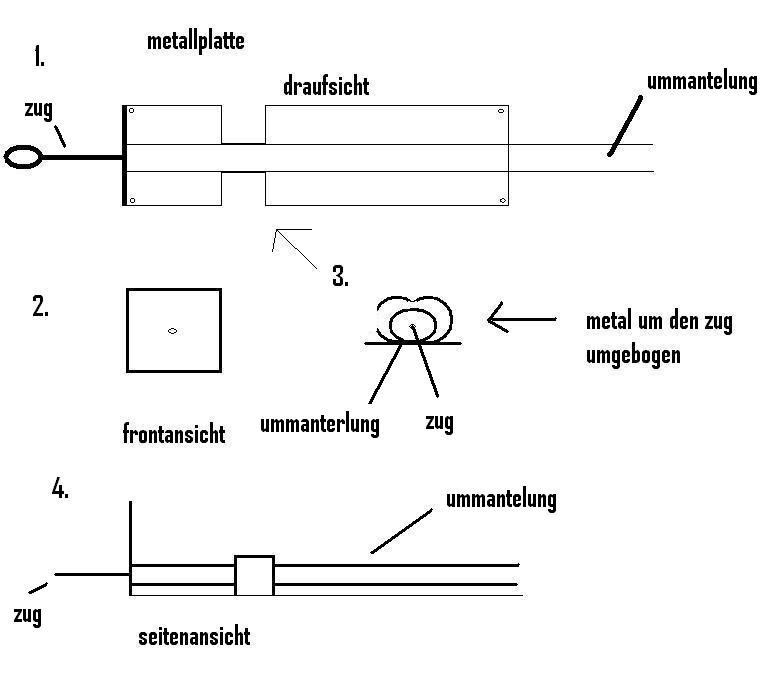 so, muss mal eben meine idee mit dem tankdeckel neu aufrollen. und zwar habe ich mir gedacht eine platte zu nehmen, ne kleine, etwa 5x10cm, in diese platte zwei einschnitte vornehmen. wie unter pkt 3. vorne das blech einmal und 90° biegen und ein loch reinbohren. wie bei pkt 4. ich ziehe also dann den eigentlichen zug durch das kleine loch, die ummantelung bleibt an der blechwand hängen und mit den zwei angeschnittenen blechen fixiere ich den zug in dem ich diese um den zug umbiege und ein wenig quetsche. hoffe meine kinderzeichnung ist zu verstehen :zwinker: