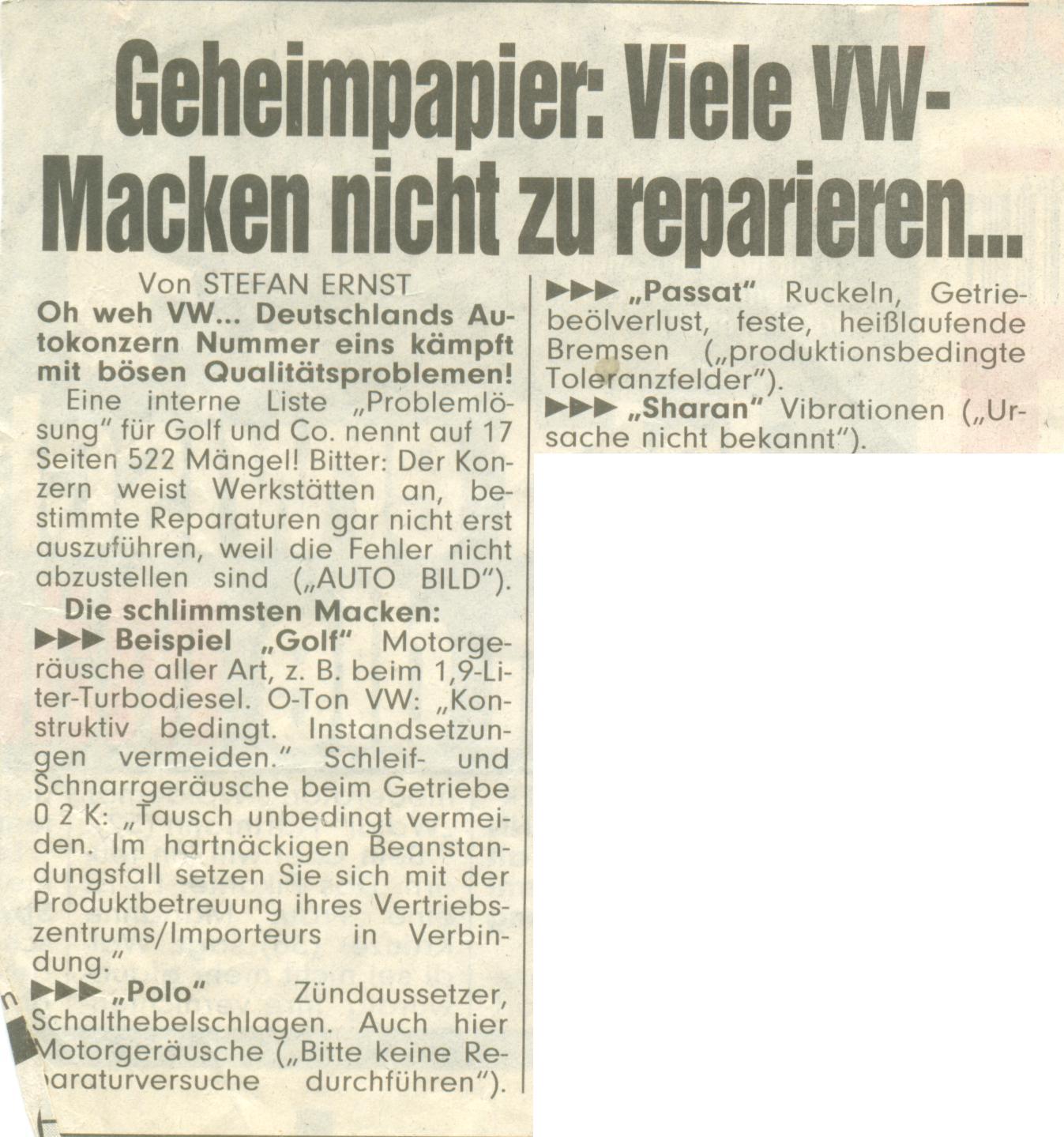 VW, sowie auch BMW, Audi und Mercedes haben sichtlich gute Connections zu den Medien, sodass üble Qualitätsprobleme wie VW´s TSI-Motor-Lachnummer, welche teilweise schon vor dem 10.000sten Kilometer alle viere von sich streckt und Probleme von Mercedes-Benz mit brechenden Federtellern (bei den W200-Modellen), brechenden Federn, welche Reifen aufschlitzen (BWM E39-Modelle) kaum oder nur in dosiertem Maß in die Öffentlichkeit gelangen....