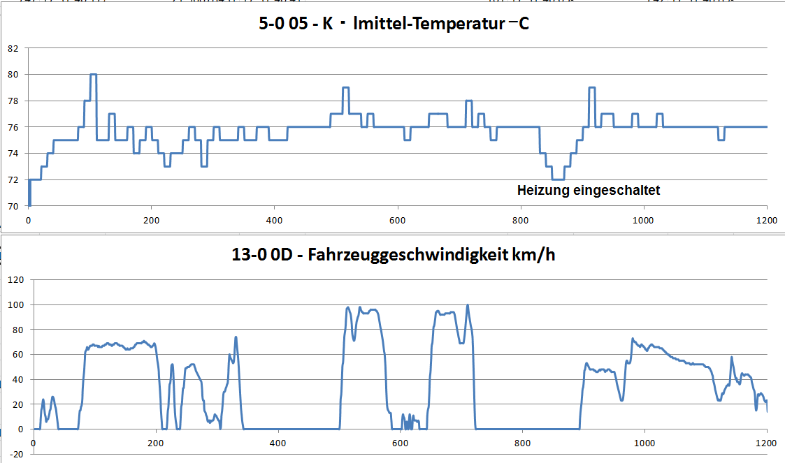 - Fahrt auf Landstraße im Bergeland, relativ zügige Fahrt mit aussreichend Luftstrom zur Kühlung, Aussentemperatur minus 8 °C, Motortemp. so ca. 75°C !!