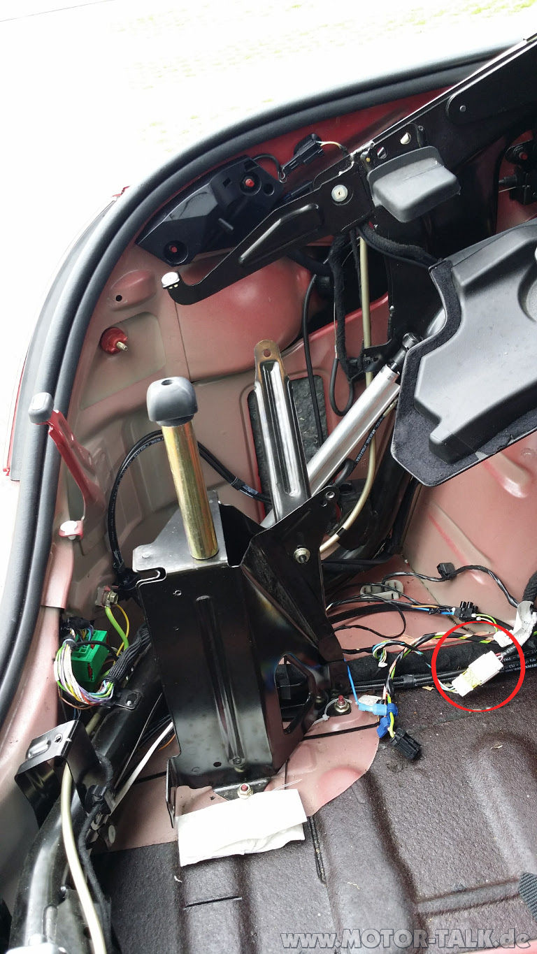 Hinter der linken Kofferraumverkleidung befindet sich u. a. ein weißer Kontaktstecker der die linke Kennzeichenbeleuchtung mit dem Anschlussterminal vor dem LED-Rücklicht verbindet. Davon weg führt eine Kabelverbindung hinter der linken Kofferraumverkleidung aus dem Kofferaum durch eine Gummiabdichtung hinaus und weiter unter dem Fahrzeugboden durch einen Kabelschutzschlauch geschützt hinter die Stoßstange zur Kennzeichenbeleuchtung.