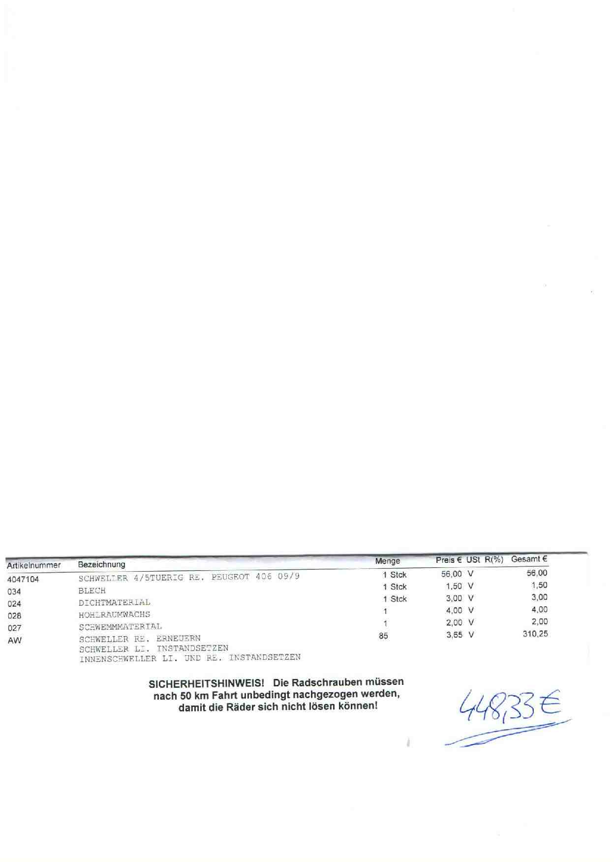 Um seinen 20igsten Geburtstag zu erleben, habe ich mich zur Reparatur entschlossen. Ich denke, der Preis ist für ein Karosseriewerkstatt ok.