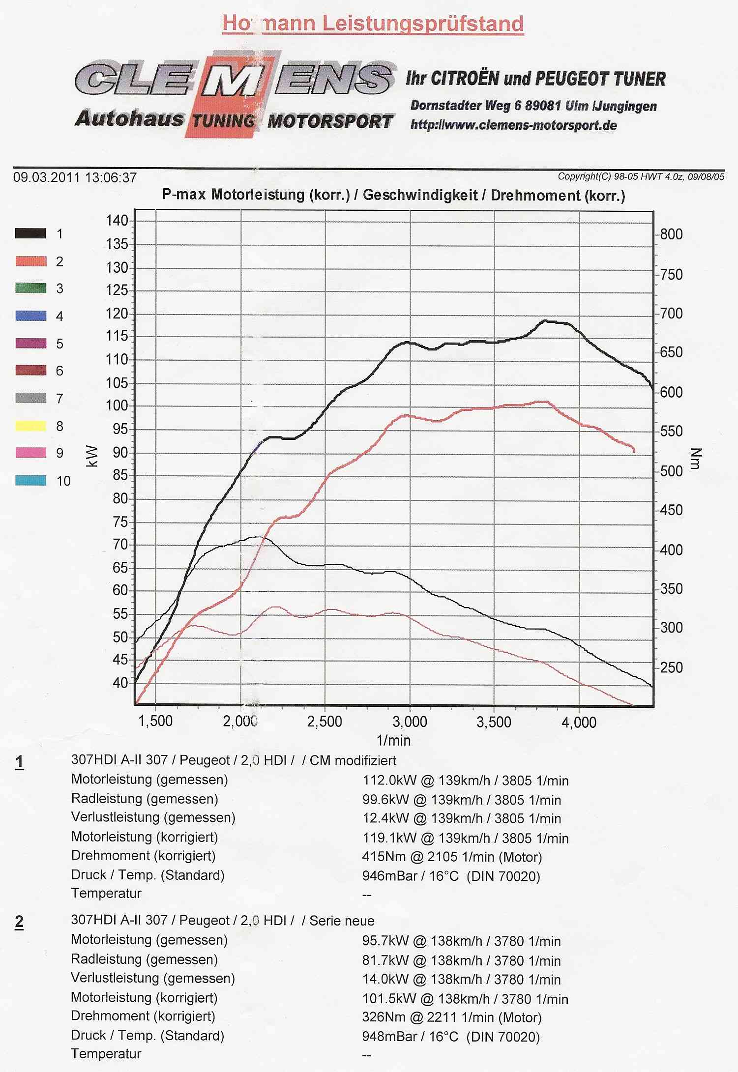 also ich war am Mittwochch bei Clemens...die fahrt bis dorthin war angenehm(Augsburg-Ulm), toller sonniger Tag. Ich wurde herzlich begrüßt und durfte mich einwenig umsehen...alle sind dort wirklich sehr nett, ist übrigens ein Familienbetrieb und das merkt man absolut, die haben sich echt um mich gekümmert und haben mich und meine freundin für die Abstimmungszeit in die Stadt gefahren und wieder abgeholt. Dann habe ich Jürgen Clemens kennengelernt, wirklich ein sehr netter und unkomplizierter Mensch...er hat mir einwenig was zum ablauf erklärt und wie die Leistungsteigerung zustande kommt...also sind wir gleich auf den Prüfstand gekommen und haben das Auto draufgeschmissen, war Nice zusehen wie er den kleinen rannimmt...der hat dann süße 101kW und 326Nm aus meinem 307 2.0 HDI gedrückt...soweit so gut. Bei der eigentlichen abstimmung war ich nicht dabei(beim Shoppen).So und hier mal das resultat...