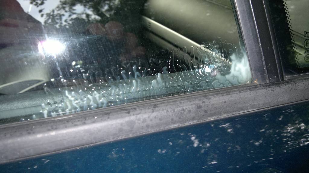 Momentan ist es nur an einer Ecke, am Übergang zum kleinen Dreiecksfenster vorne. Ist auch nur an dieser Scheibe momentan.