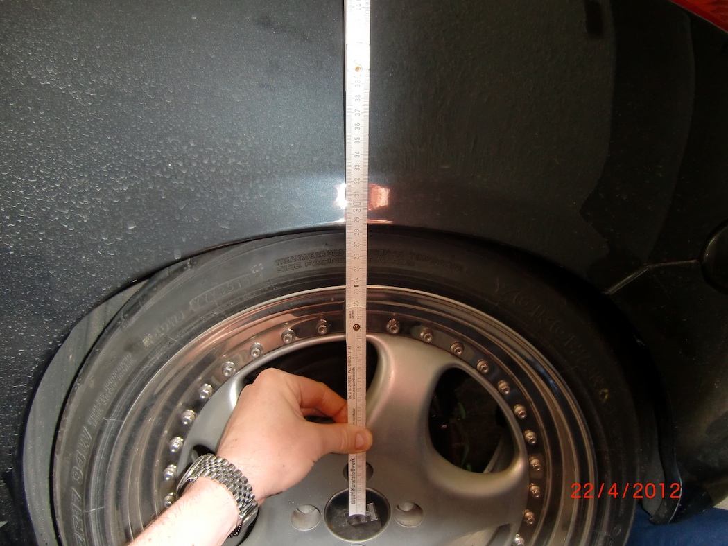 In der Regel wird die Hinterachse zwischen 30 und 35 mm an die Vorderachse angeglichen. Bei der Maximalen Tieferlegung ist das dann 28,5 cm Von Radmitte bis oberer Rand Radausschnittskante.
