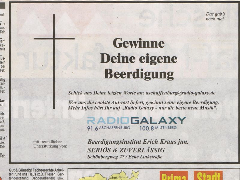 okay - in dieser "zeitung" hat´s keine todesanzeigen.. das ist eher das, was man landläufig als "schmierblättchen" bezeichnen würde, aber dennoch finde ich es mehr als befremdlich, so zu werben...