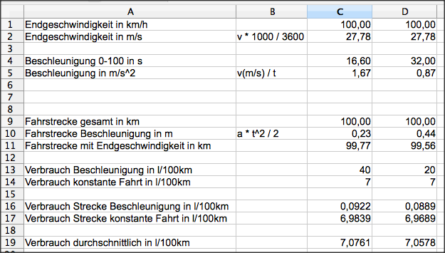 Klar ist, die Länge der Gesamtstrecke ist nicht von Bedeutung. Auch gehen wir davon aus, dass es Idealbedingungen sind, sprich, der Verbrauch beim Beschleunigen konstant, es keine äußeren Einflüsse gibt usw.