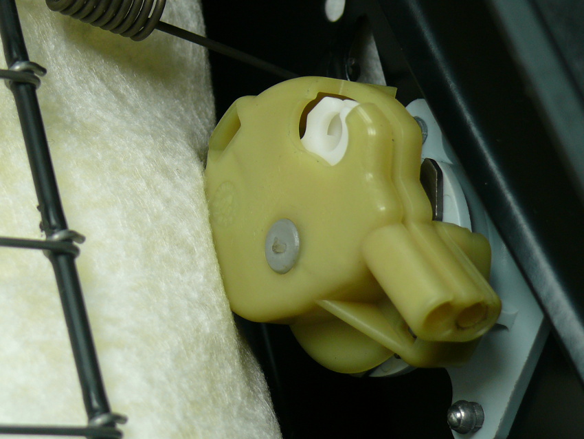 anbei ein Foto: da steckt jetzt das linke, kugelförmige Ende des Bowdenzugs des Mechanismus für die Lendenwirbelstütze (und darunter in dem Loch, in dem Schlitz rechts, da muss es gesteckt haben [meine Annahme])